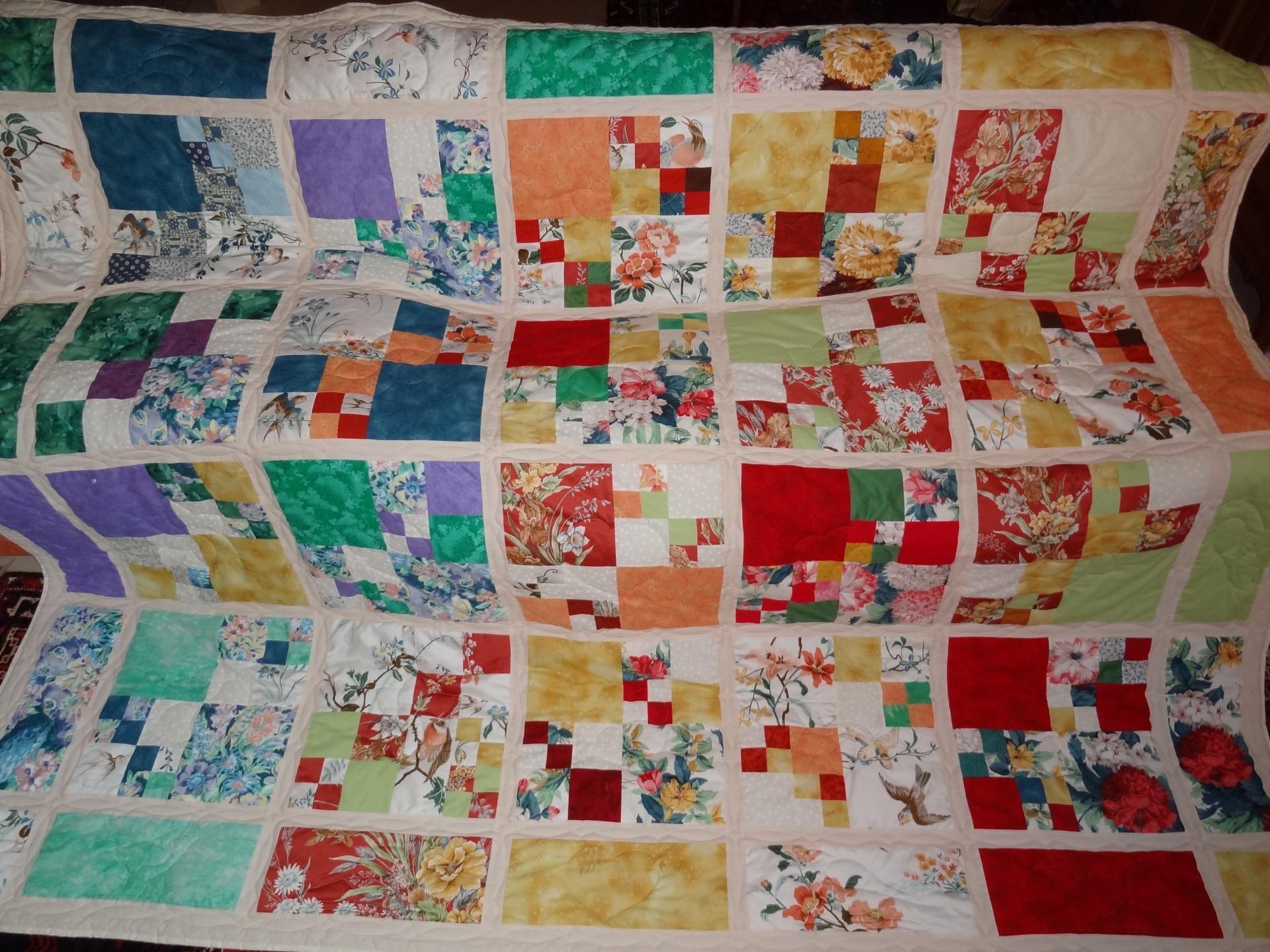 Le couvre-lit est composé de 25 blocs de couleurs différentes séparés par des bandes de couleur neutre.